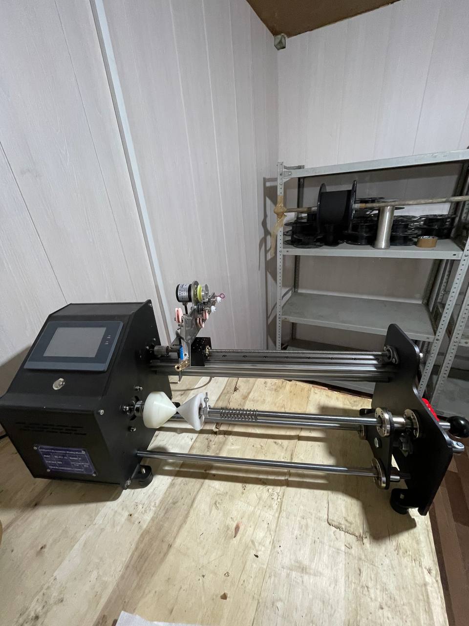 Мы дополнили этот станок, оборудованием для нанесения клея на оптоволокно и поставили специальную, разборную катушку, для внутренней размотки, таким образом окопный станок сможет наматывать внутреннею размотку без шпули!